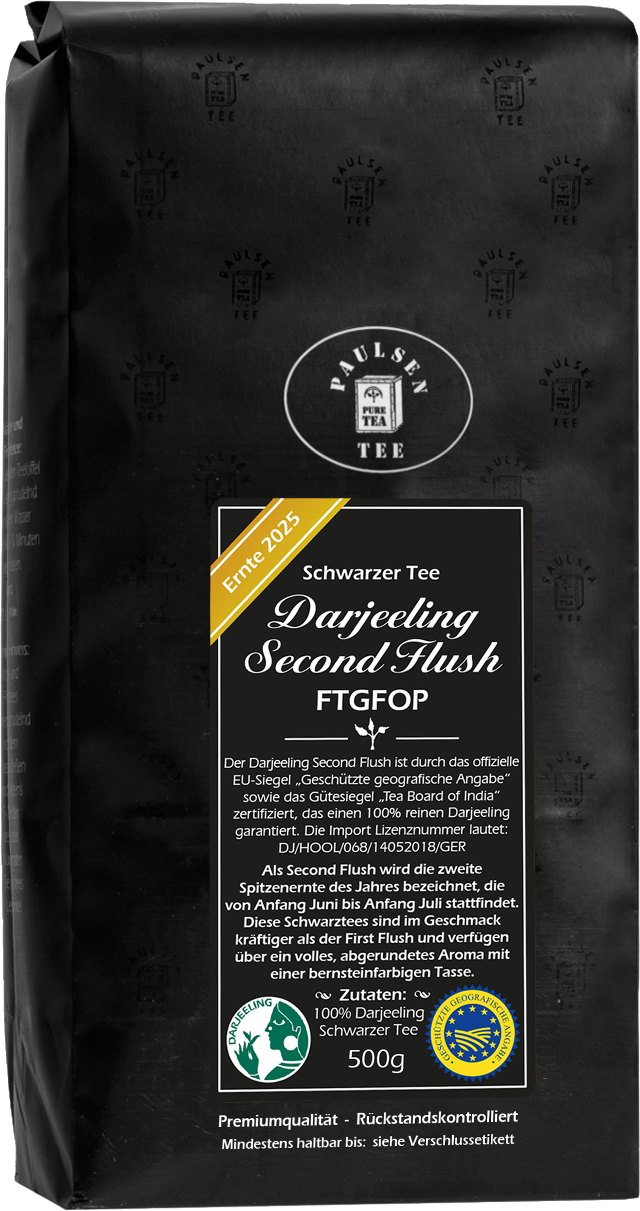 Als Second Flush wird die zweite Spitzenernte des Jahres bezeichnet, die von Anfang Juni bis Anfang Juli stattfindet. Diese Schwarztees sind im Geschmack kräftigerals der First Flush und verfügen über ein volles, abgerundetes Aroma mit einer bersteinfarbigen Tasse.