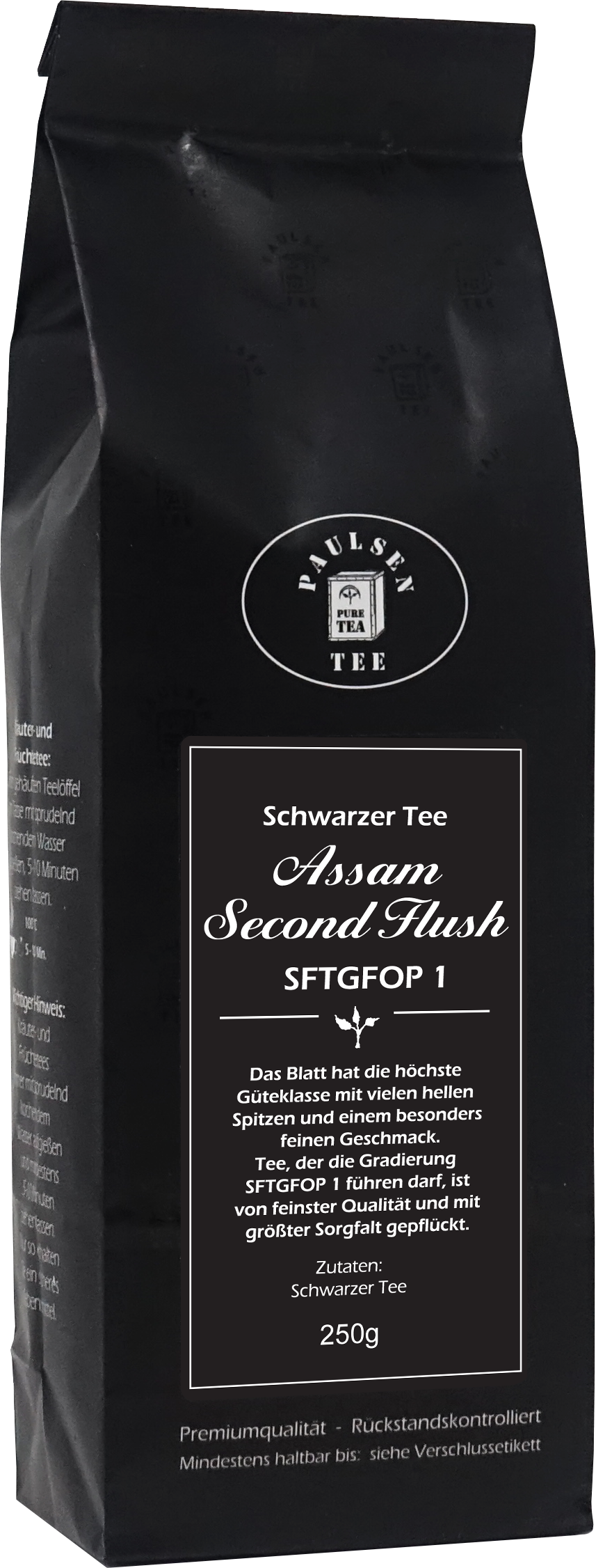 Teezubereitung: Die Teekanne zum Vorwärmen mit heißem Wasser ausspülen. Einen gehäuften Teelöffel Paulsen Schwarzer Tee pro Tasse mit frischem, kochendem Wasser aufgießen. Anschließend den Tee 3-5 Minuten ziehen lassen.