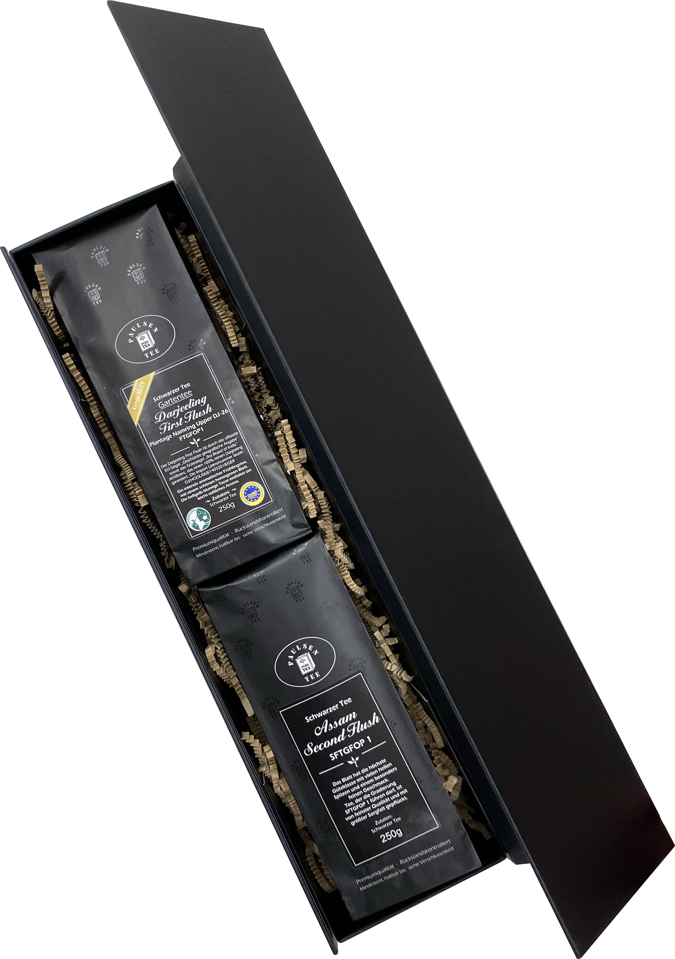 In einem hochwertigen Geschenkkarton mit Magnetverschluss präsentieren wir unseren Darjeeling First Flush von der Plantage Namring Upper, Ernte 2025 und den Assam Second Flush, Ernte 2024.