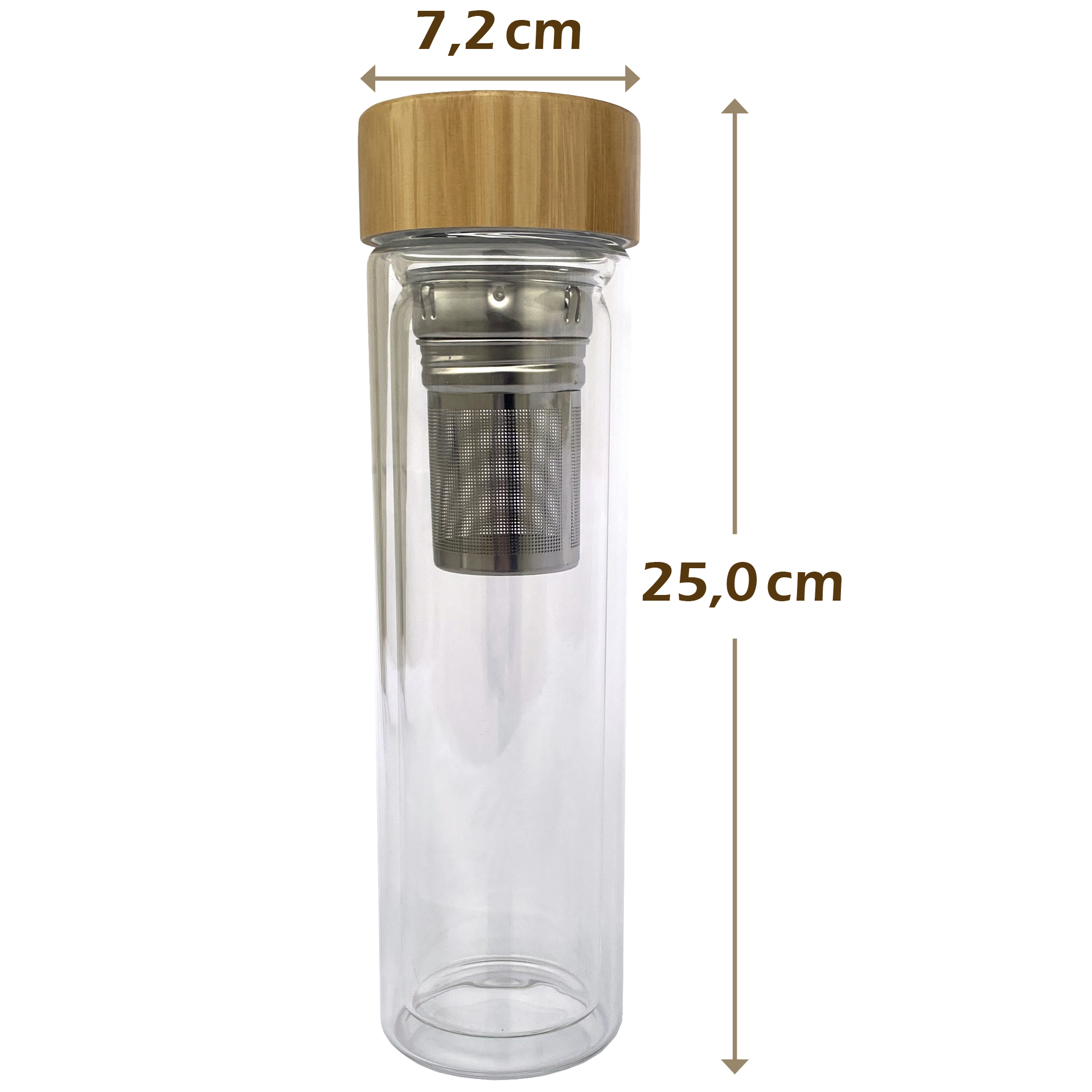 Genießen Sie unseren Tee auch unterwegs frisch aufgebrüht in der Glasflasche mit integriertem Infusor/Teesieb. Dank des doppelwandigen Glases können Sie ihr Getränk heiß oder kalt immer dabeihaben. Die Glasflasche hat ein Fassungsvermögen von ca. 500ml und ist mit dem Bambusdeckel ein echter Hingucker.