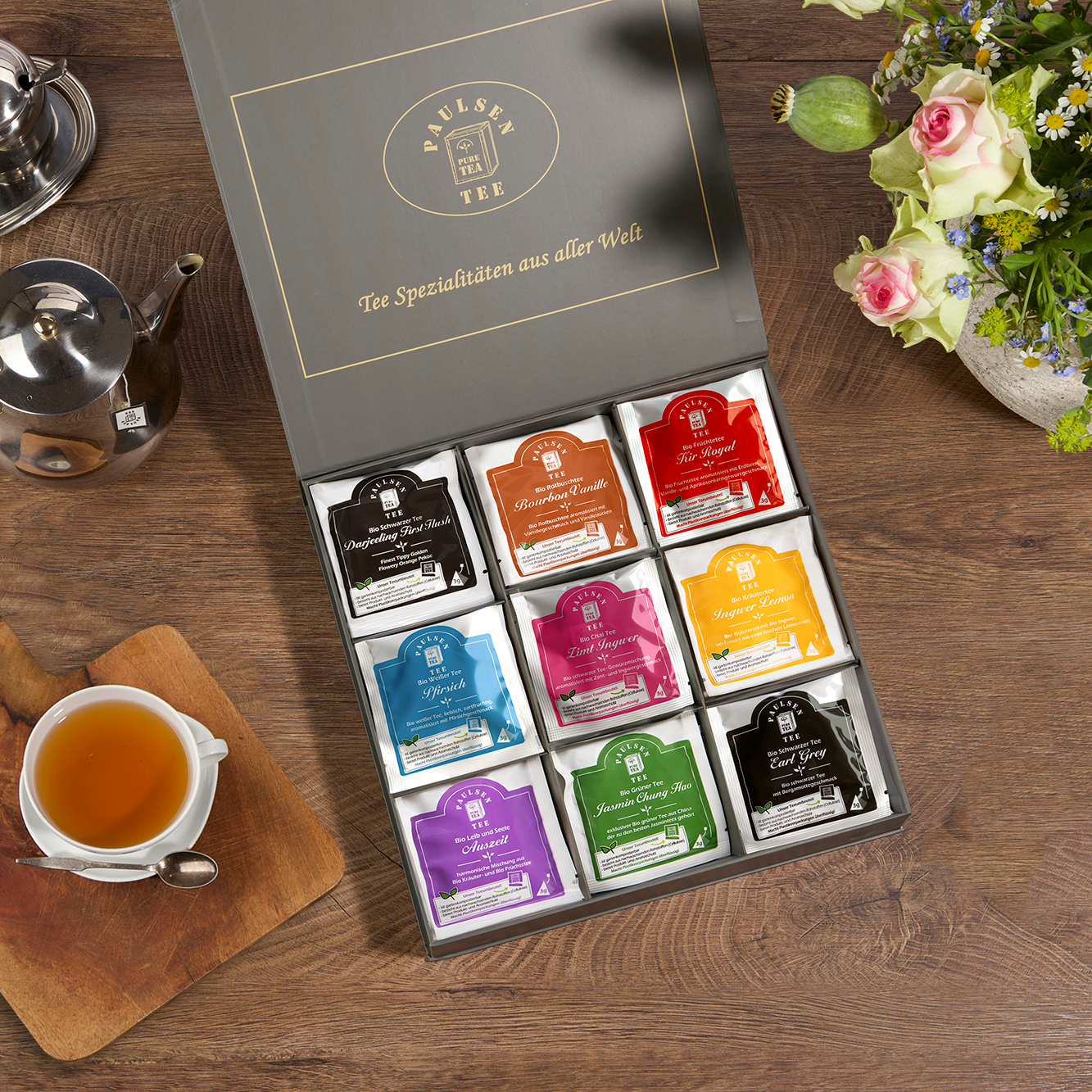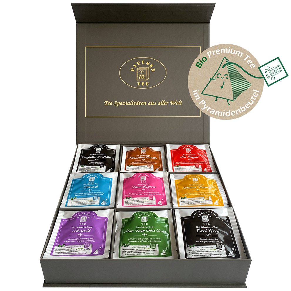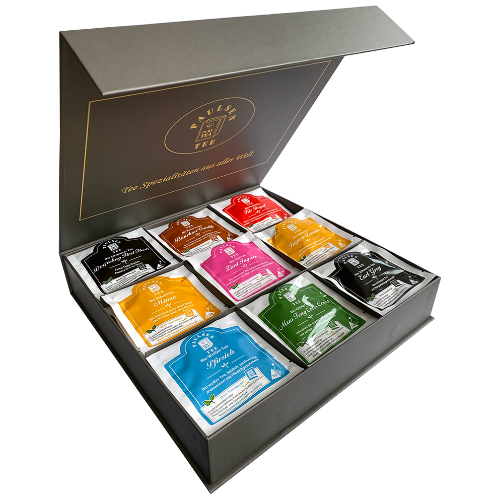 Diese stillvolle Magnetbox ist gefüllt mit 45 Pyramidenbeutel. Dieser Karton eignet sich hervorragend als Geschenk oder als dekorativer und wohlschmeckender Hingucker in Ihrer Küche. Auch eignet sich diese Auswahl perfekt für die Teeküche an Ihrem Arbeitsplatz, durch die Vielfältigkeit dieser Box ist für jeden Teetrinker genau das richtige dabei.