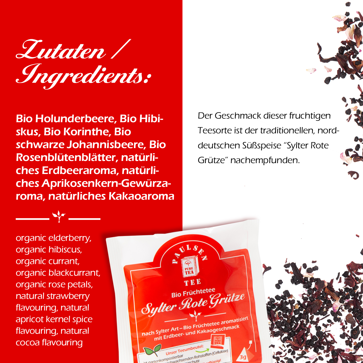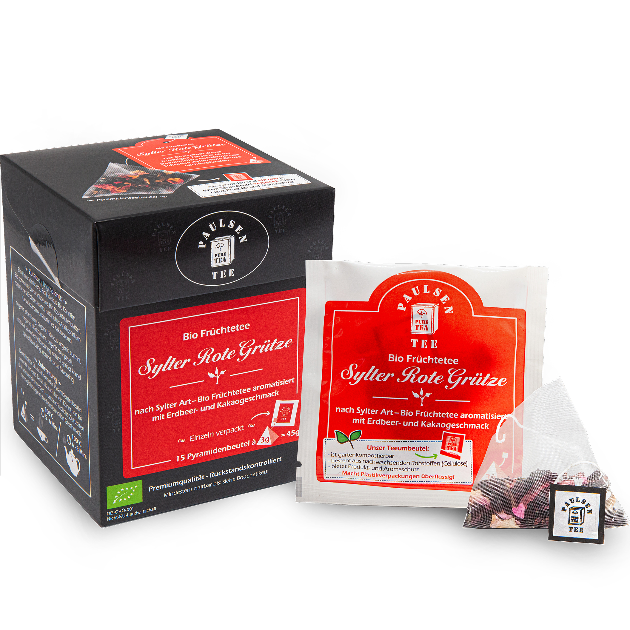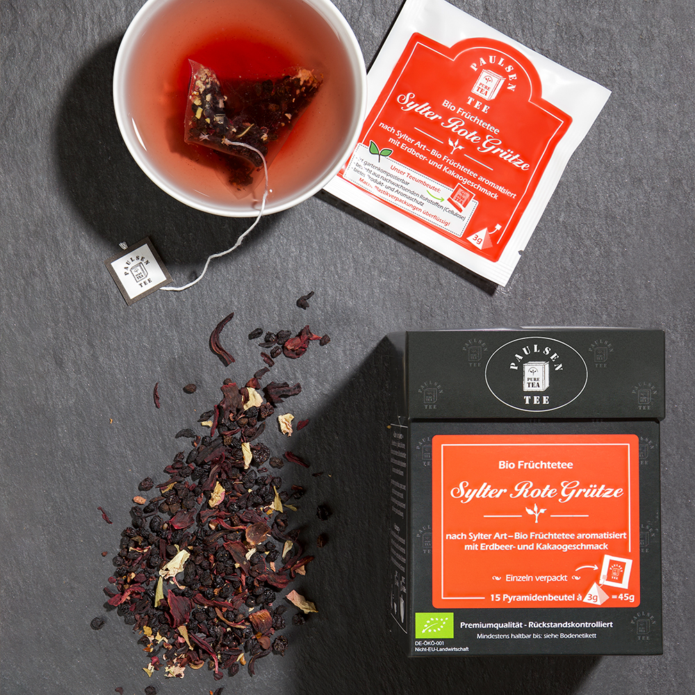 Der Geschmack dieser fruchtigen Teesorte ist der traditionellen, norddeutschen Süßspeise "Sylter Rote Grütze" nachempfunden. Der fruchtige Geschmack der roten Früchte wird geschmacklich mit einer Note von Kakao abgerundet. Diese Mischung bietet abwechslungsreiche Erfrischung, sowohl im Winter als auch im Sommer als Eistee.