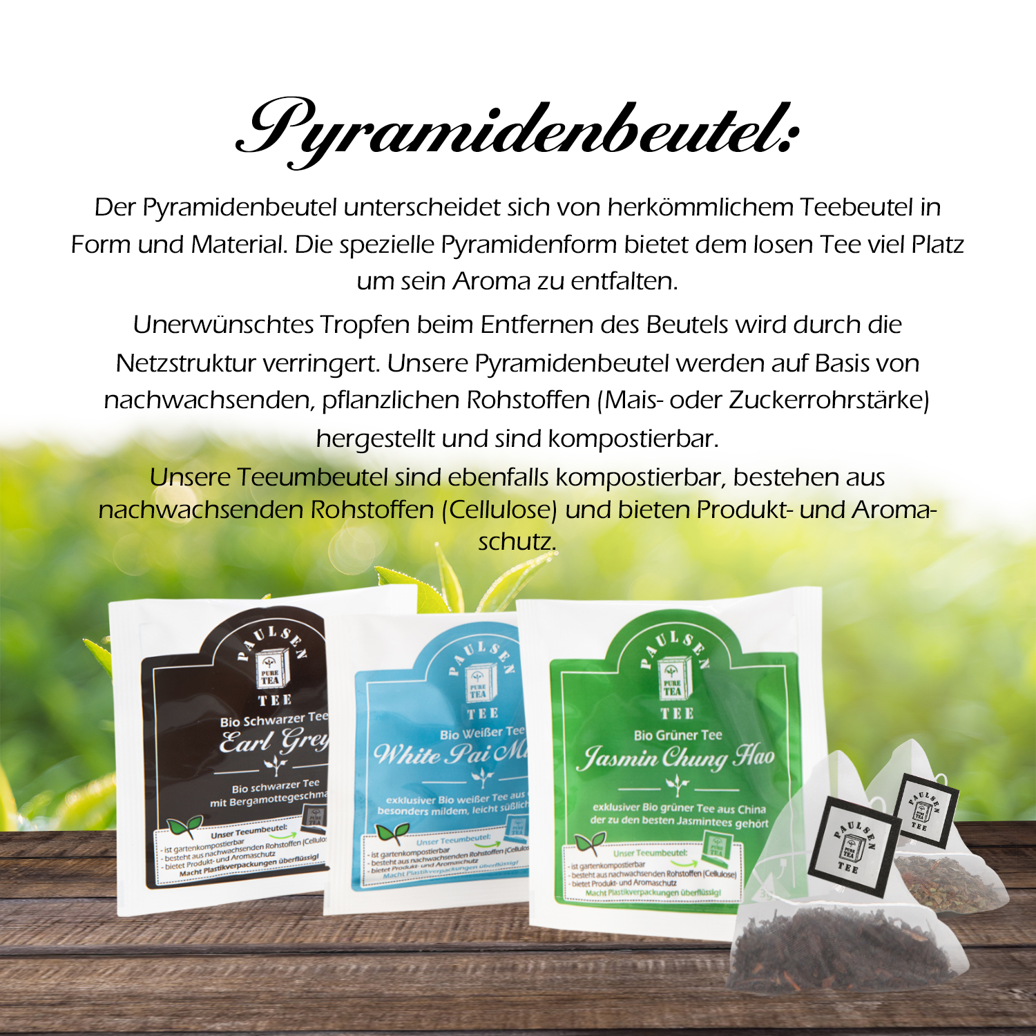 Unsere Pyramidenbeutel werden auf Basis von nachwachsenden, pflanzlichen Rohstoffen (Mais- oder Zuckerrohrstärke) hergestellt und sind kompostierbar.