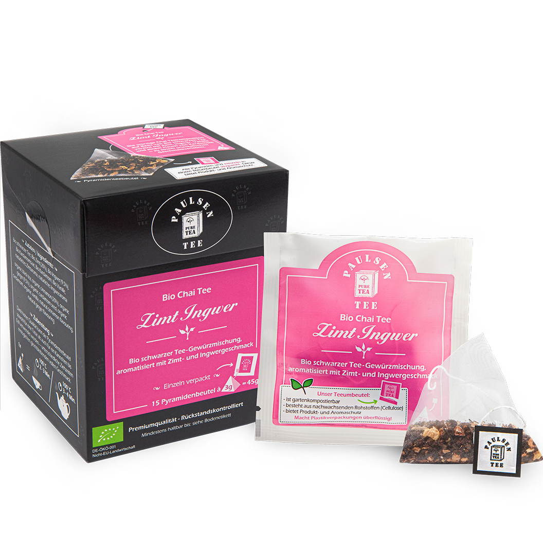 Teezubereitung: Einen Pyramidenbeutel Bio Zimt Ingwer Schwarzer Tee pro Tasse mit frischem, kochendem Wasser aufgießen. Anschließend den Tee 2-3 Minuten (bei einem Kännchen 3-4 Minuten) ziehen lassen.