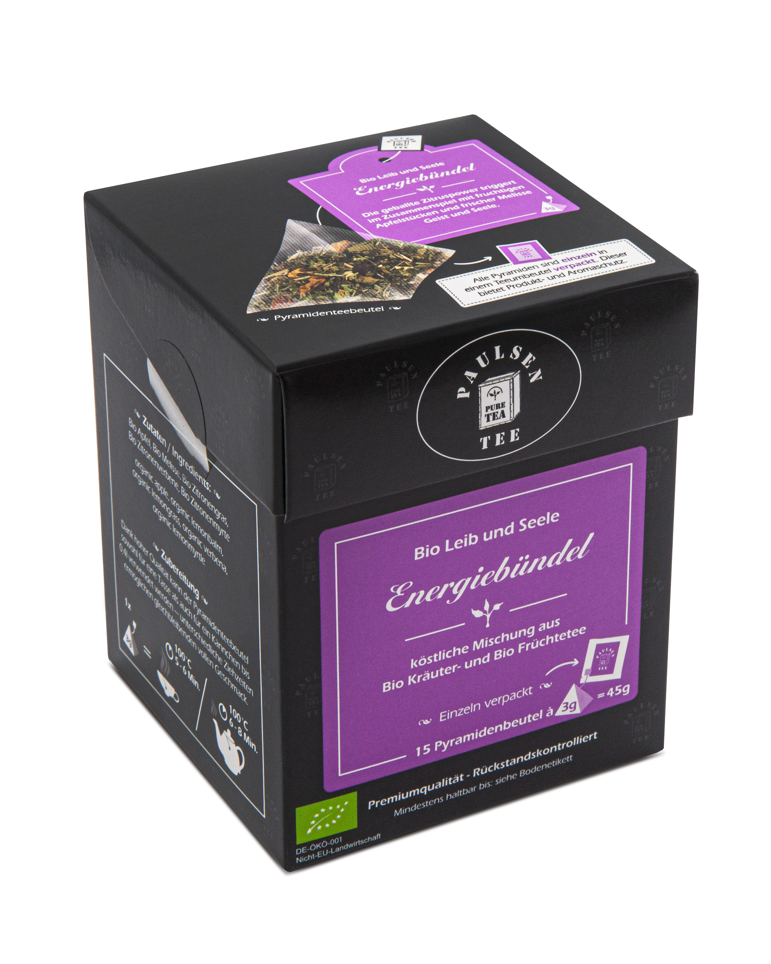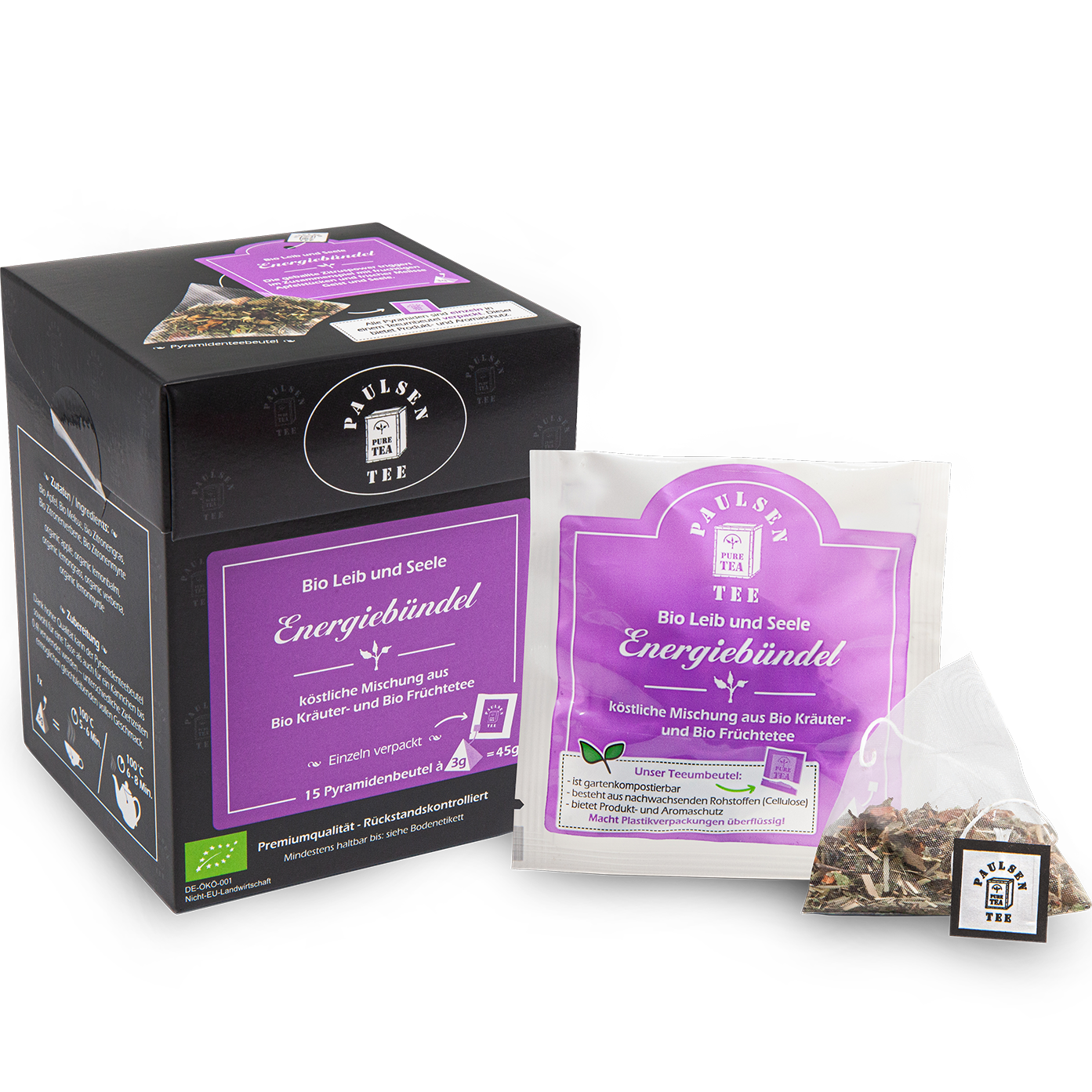 Teezubereitung: Einen Pyramidenbeutel Bio Energiebündel Kräuter- und Früchtetee pro Tasse mit frischem, kochendem Wasser aufgießen. Anschließend den Tee 5-6 Minuten (bei einem Kännchen 6-8 Minuten) ziehen lassen.