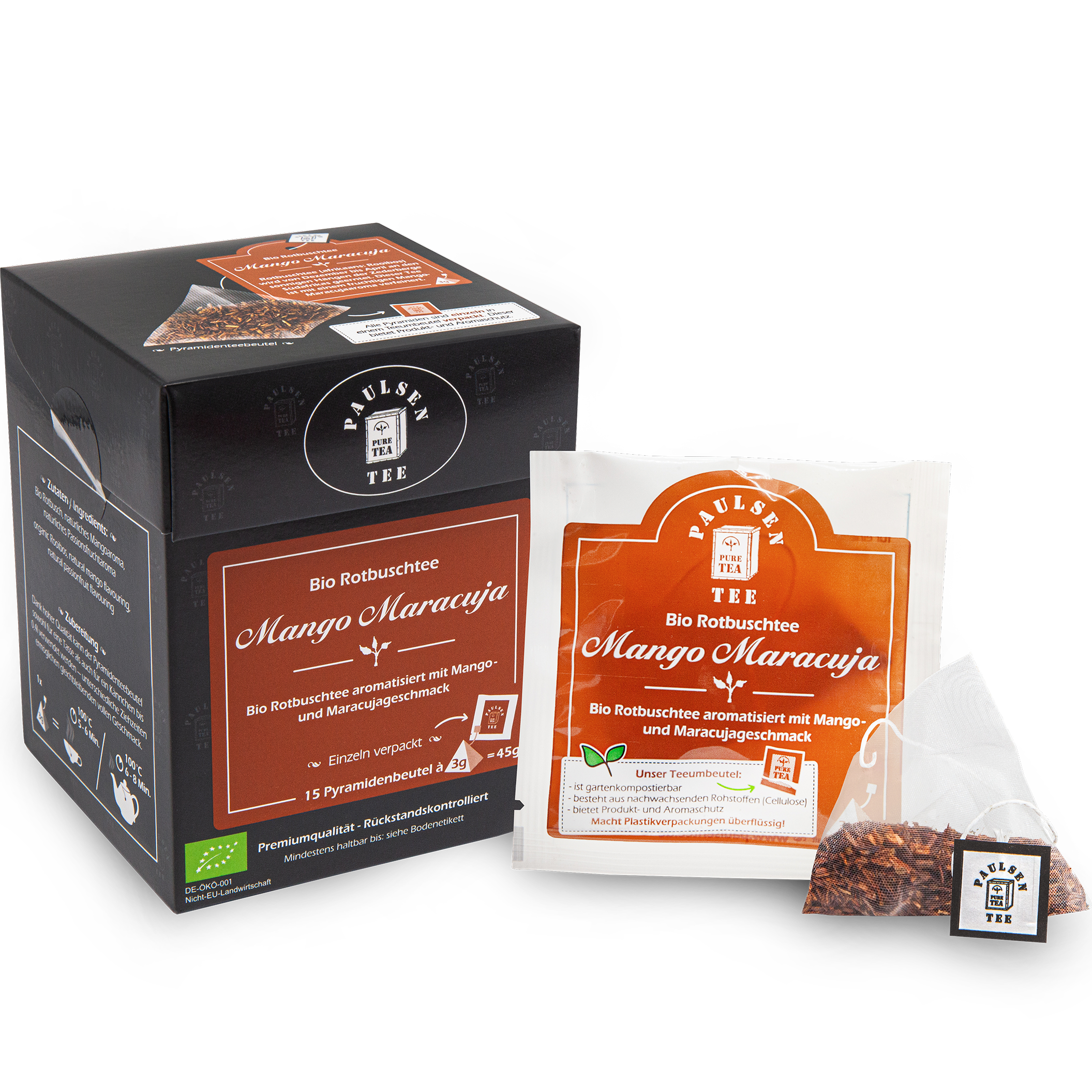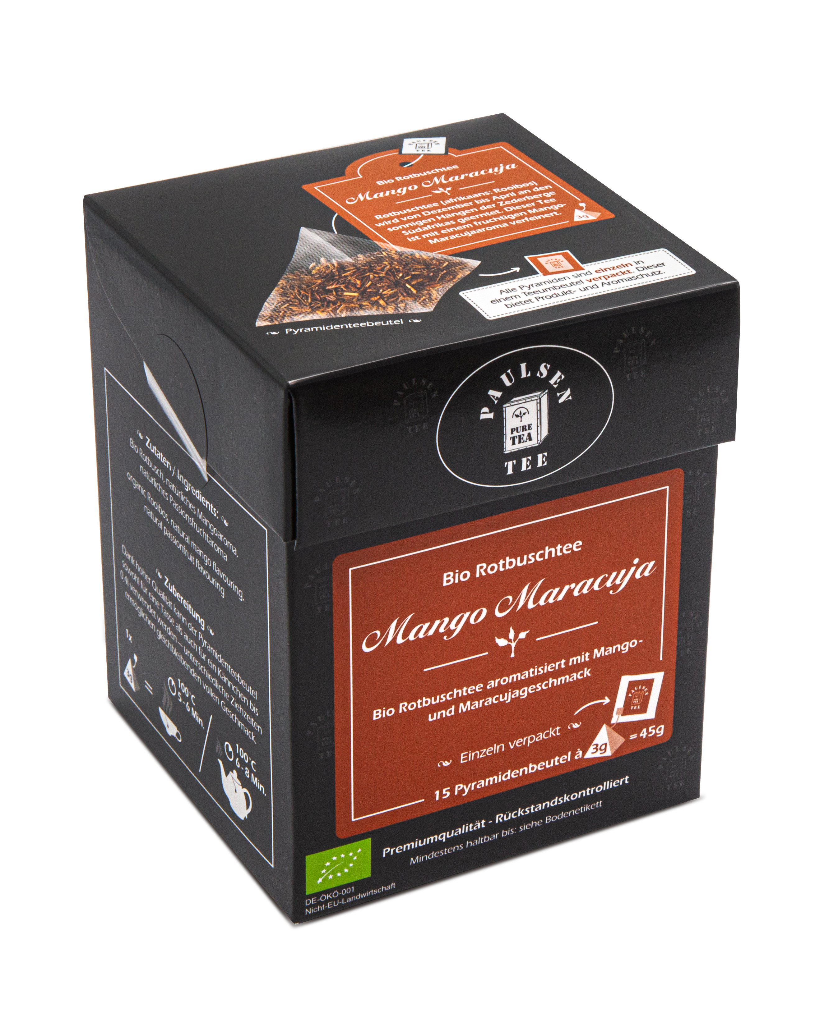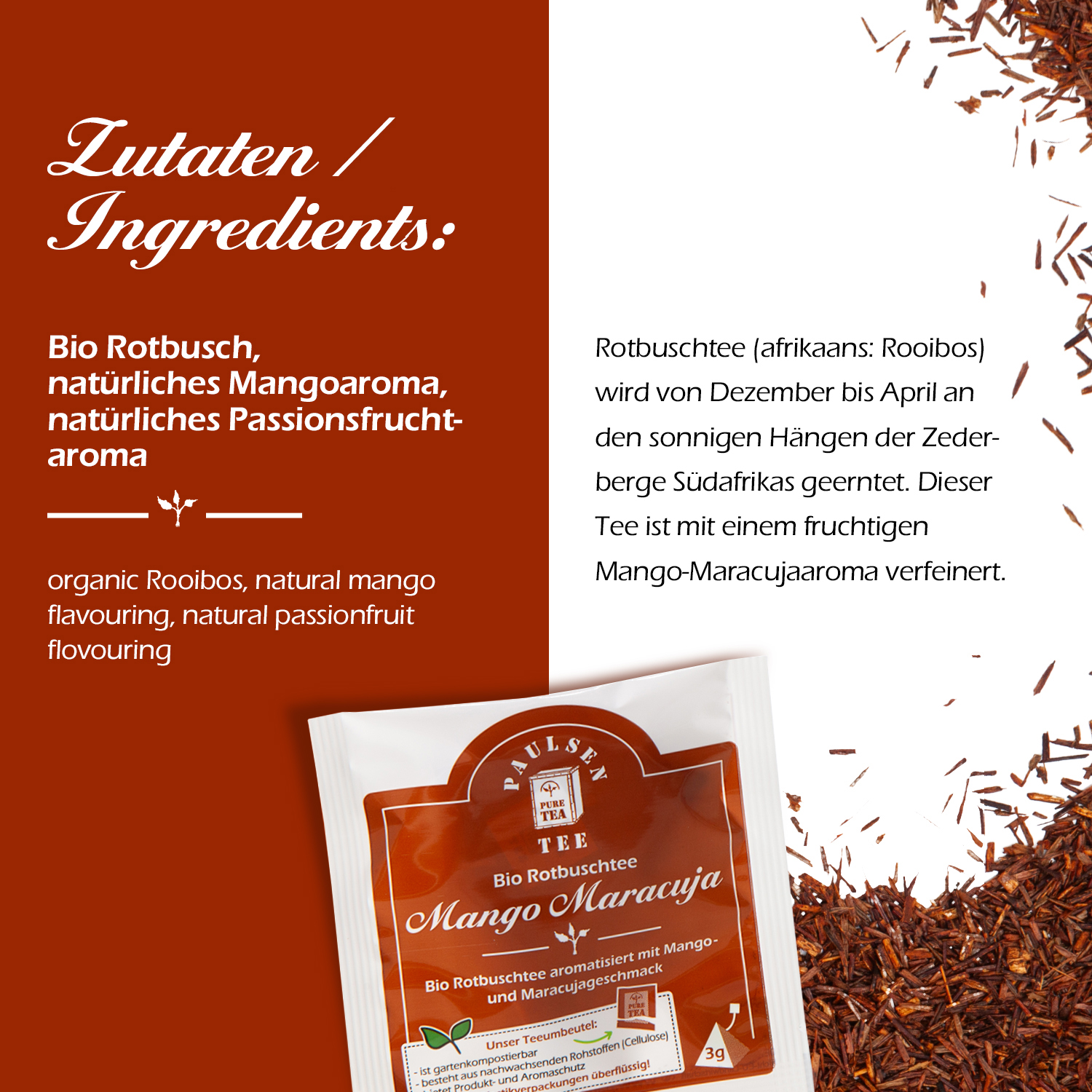Rotbuschtee (afrikaans: Rooibos) wird von Dezember bis April an den sonnigen Hängen der Zederberge Südafrikas geerntet. Dieser Tee ist mit fruchtigen Mango- und Maracujaaromen verfeinert. Diese Mischung bietet abwechslungsreiche Erfrischung, sowohl im Winter als auch im Sommer als Eistee.