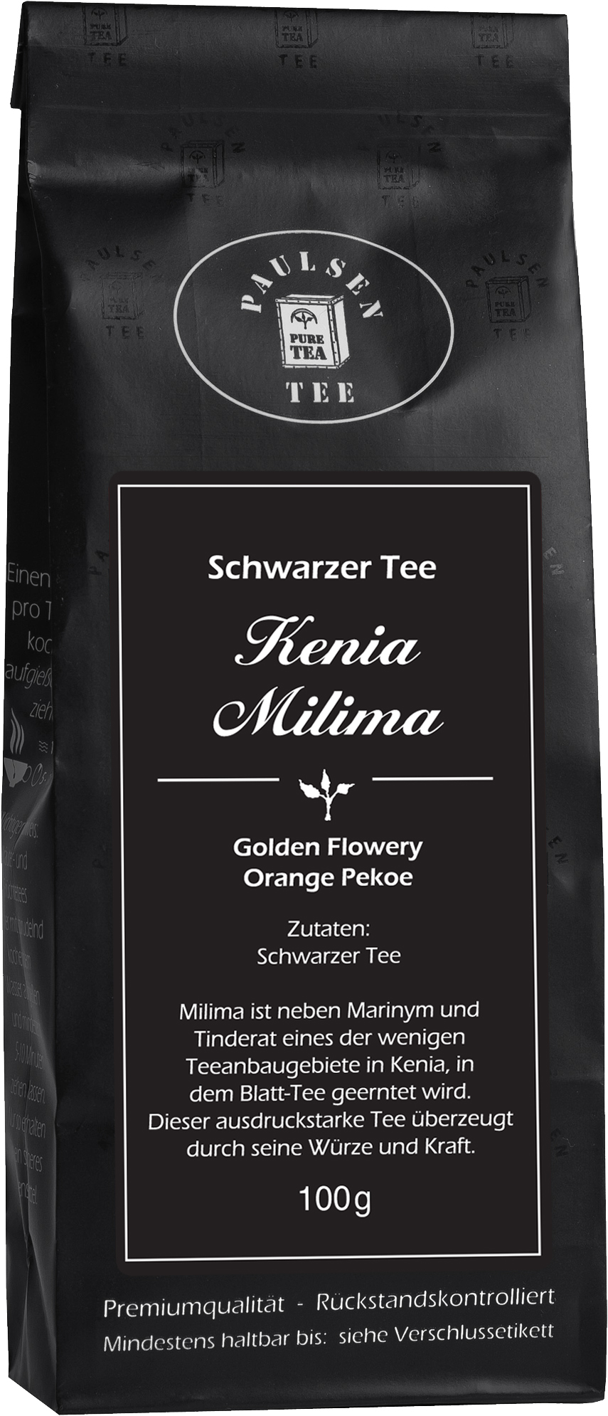 Milima ist (neben Marinym und Tinderat) eines der wenigen Anbaugebiete für Blatttee im afrikanischen Kenia. Bei dem ausdrucksstarken Kenia Milima-Schwarztee handelt es sich um einen sogenannten Golden Flowery Orange Pekoe (GFOP), also um eine besonders erlesene Teespezialität, die aus feinsten Blattspitzen und hochwertigen Teeblättern gleichermaßen zusammengesetzt ist. Diesen vollwürzigen Tee trinken Genießer pur oder leicht gesüßt.