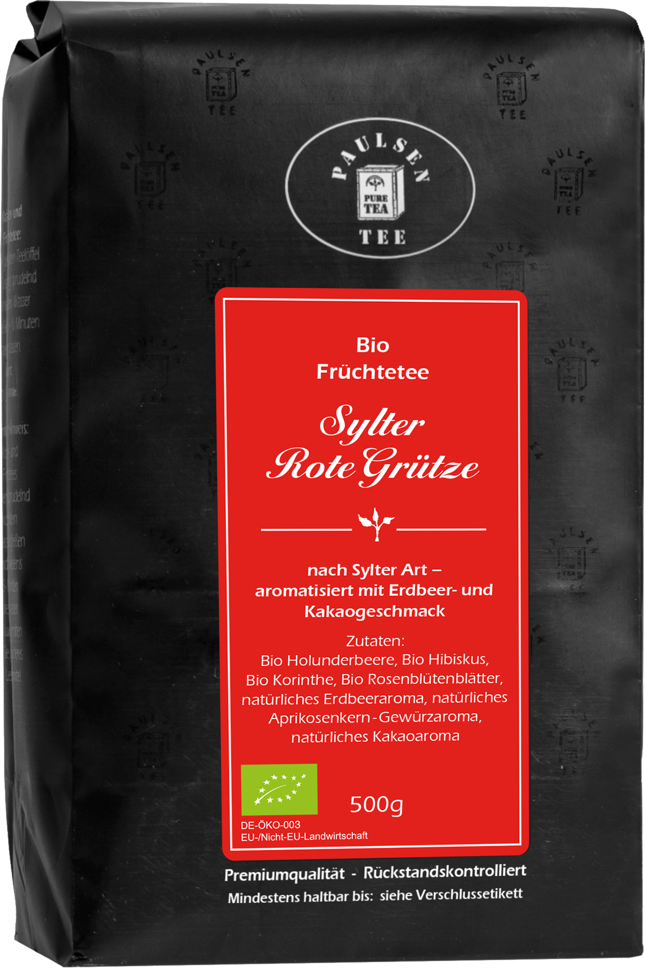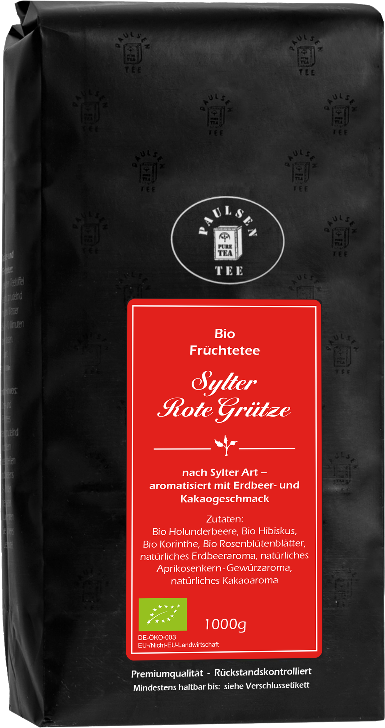 Der Bio-Tee Sylter Rote Grütze ist der gleichnamigen, traditionellen, norddeutschen Süßspeise nachempfunden. Der fruchtige Geschmack der roten Früchte wird geschmacklich mit einer Note von natürlichem Kakaoaroma abgerundet. Wie jeder Früchtetee ist auch dieses fruchtig-aromatische Aufgussgetränk koffein- sowie fast vollkommen kalorienfrei. Daher kann der Sylter Rote Grütze-Tee pur oder leicht gesüßt zu jeder Tageszeit genossen werden. Diese Mischung bietet abwechslungsreiche Erfrischung, sowohl im Winter als auch im Sommer als Eistee.
