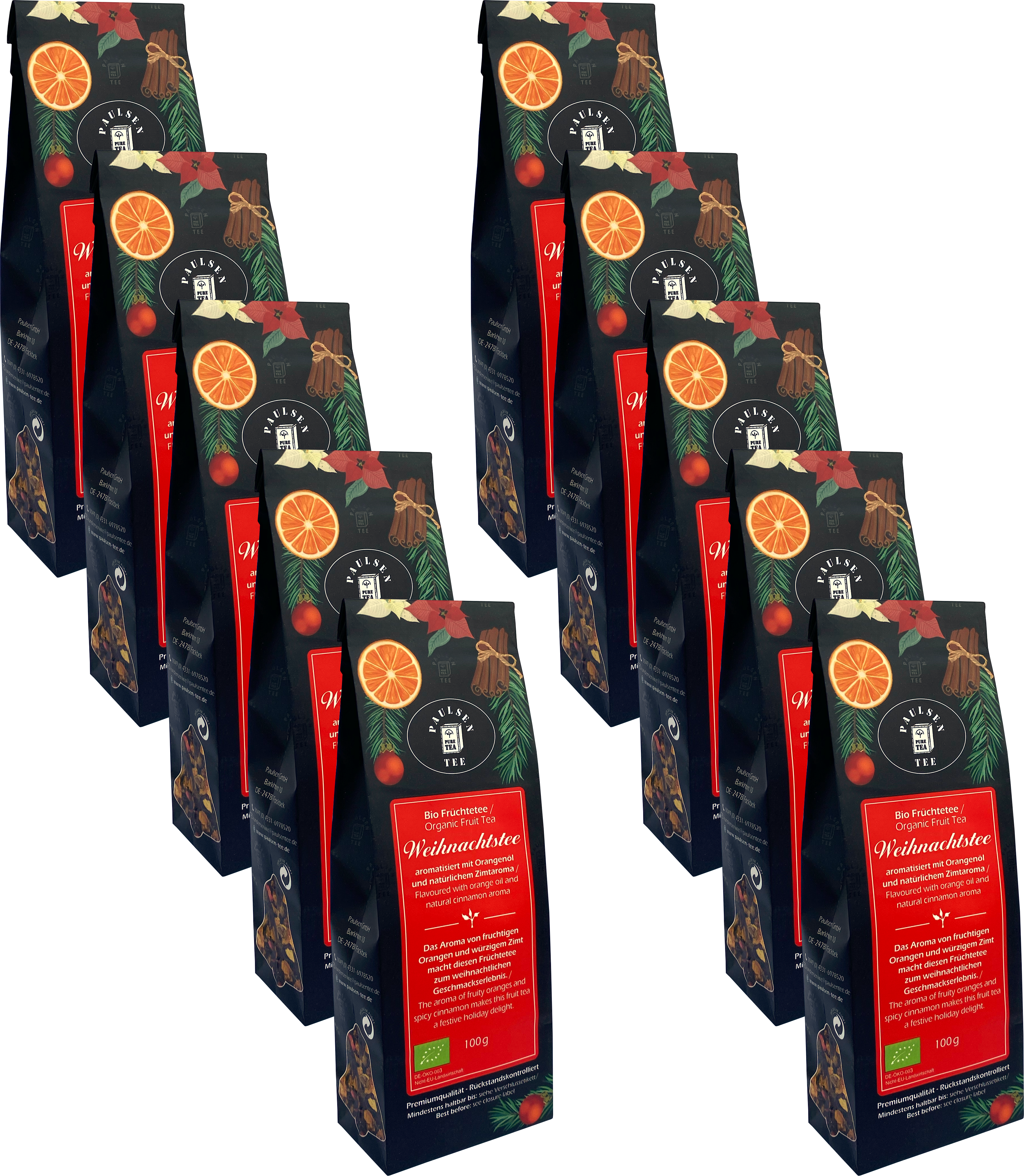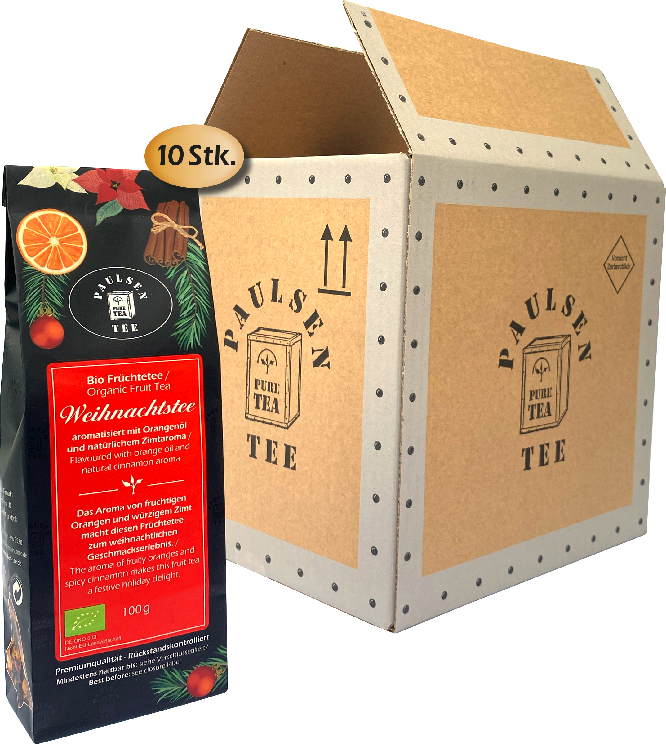 Das Aroma von fruchtigen Orangen und würzigem Zimt macht diesen Früchtetee zum weihnachtlichen Geschmackserlebnis. Genießen Sie den koffeinfreien und fast vollständig kalorienfreien Bio Weihnachtstee gesüßt oder pur, um sich in eine adventliche Festtagsstimmung zu versetzen. Schon beim Aufbrühen des würzig-fruchtigen Heißgetränks verbreiten sich aromatische Duftnoten in Ihrer Wohnung, die Sie gedanklich in das emsige Treiben der Weihnachtsbäckerei entführen