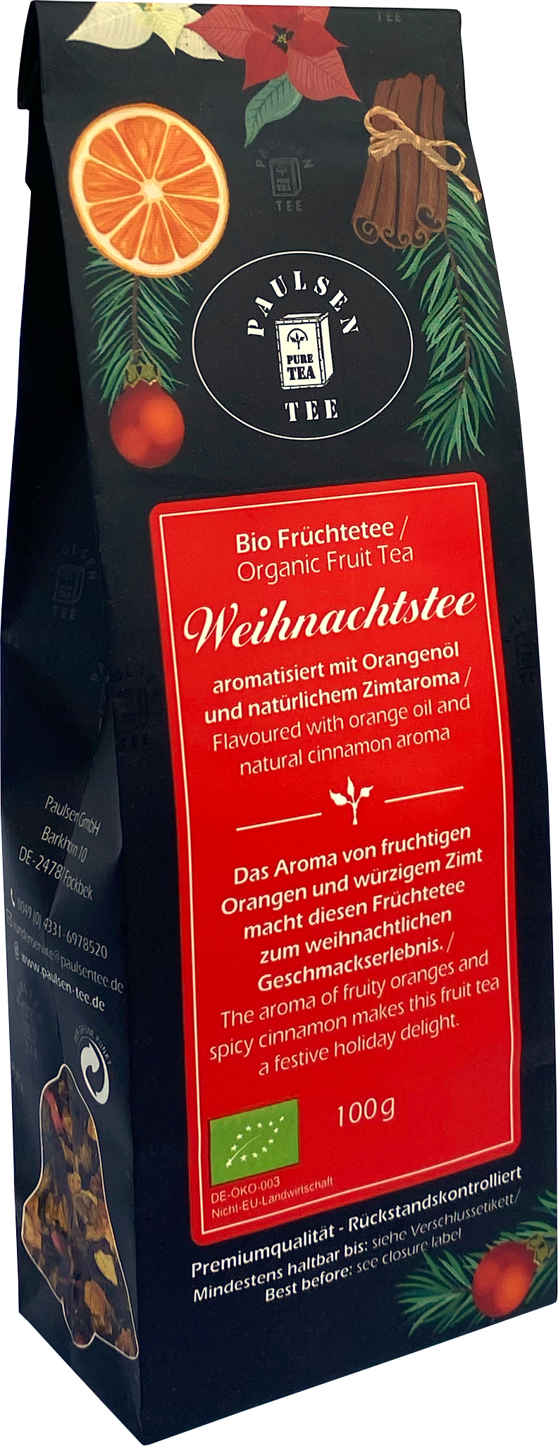 Das Aroma von fruchtigen Orangen und würzigem Zimt macht diesen Früchtetee zum weihnachtlichen Geschmackserlebnis. Genießen Sie den koffeinfreien und fast vollständig kalorienfreien Bio Weihnachtstee gesüßt oder pur, um sich in eine adventliche Festtagsstimmung zu versetzen. Schon beim Aufbrühen des würzig-fruchtigen Heißgetränks verbreiten sich aromatische Duftnoten in Ihrer Wohnung, die Sie gedanklich in das emsige Treiben der Weihnachtsbäckerei entführen